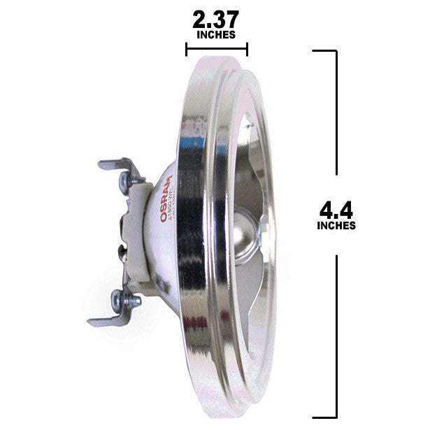 This 35 watt Osram Sylvania AR111 bulb has a beam spread of spot and a beam degree of 6. It's ansi code is AR111, the voltage is 12 and it has a base of push screw terminal. The push screw base can be used in the following applications, Stage & Studio Lighting, Specialty Lamps, Industrial lighting, Commercial lighting, and Tractor lighting. The 35 watt Osram Sylvania ar111 bulb has a diameter of 4.37 inches, a filament of C-8 and a reflector lamp finish. It's maximum overall length is 2.64 inches and a rated life of 3000 hours.